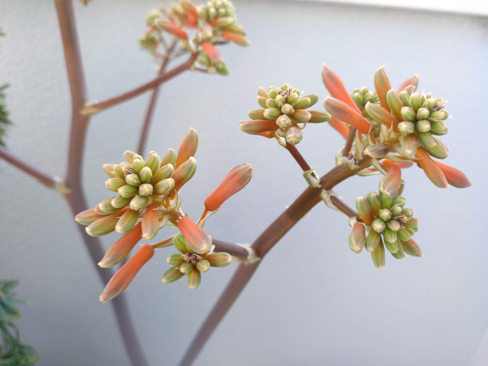 Cuando empieza a florecer, empieza a salir del centro de hojas un vástago que crece y crece hasta el metro de altura con un grupo de "campanitas" hacia abajo, de un colores rojos-naranjas muy brillantes. Las flores duran mucho tiempo. Luego cada campanita se va secando y caen por lo que también es de las plantas "no muy limpias", pero es preciosa.
